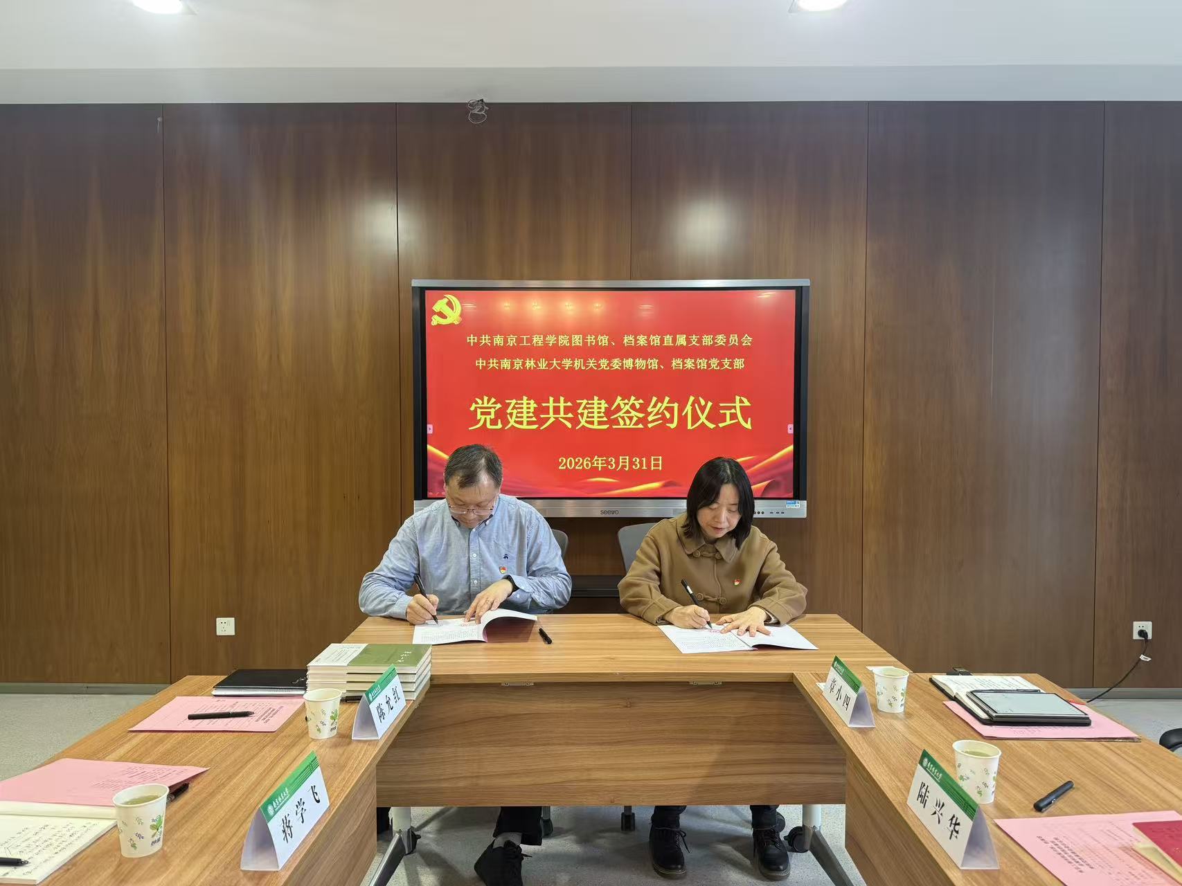 会上,与会人员围绕“党建+档案业务”展开了热烈的讨论。机关博物馆档案馆支部与中共南京工程学院图书馆、档案馆直属党支部签订了党建联创共建协议书。根据协议,共建单位党组织以组织力提升为重点,通过加强活动阵地建设,保证组织生活、学习宣传等各项工作的正常开展,共同开展丰富多彩的活动,组织党员联合上党课,提高党建工作规范化、标准化水平;有计划、有重点地组织党员开展结对互助,制定互学互帮、互带互促的具体措施,通过学习和遵守党章、结对找差等活动,增强素质、共同进步、共创业绩,促进各方思想作风、业务技能和服务水平的全面提升,做到一个党员就是一面旗帜。
